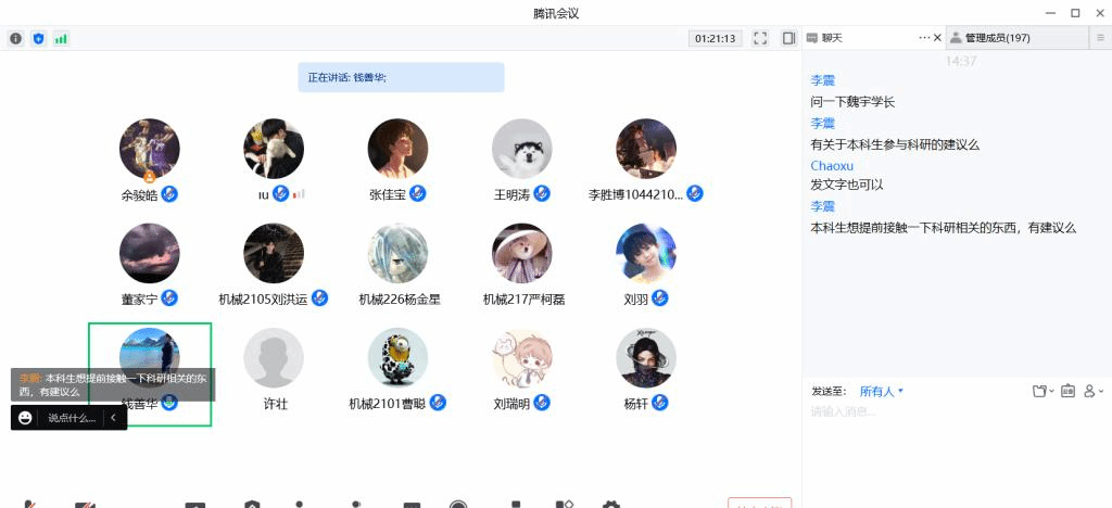 互动交流环节,针对学生提出的“本科阶段如何参与科研、如何选择学科竞赛、专业未来发展、学业压力如何解决、女性从事机械行业的前景如何”等问题,两位校友嘉宾一一详细解答。纪小刚为本次活动总结,感谢校友精彩分享的同时,引导学生思考“什么是机械工程”、“如何学好机械工程”、“如何在机械工程领域发展好自己”,鼓励学生结合自身特点筑牢基础,做好未来规划。