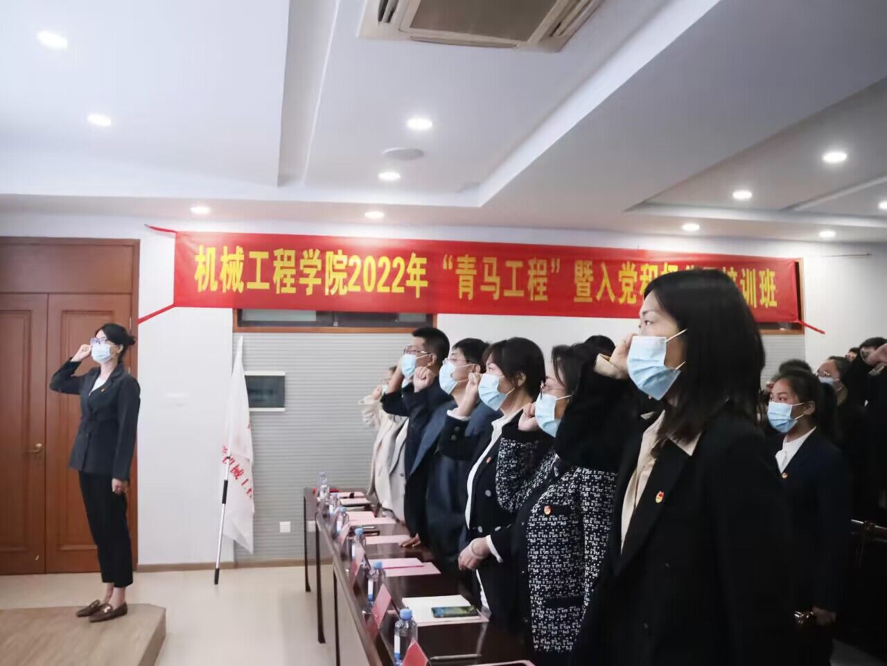 宣誓环节中,辅导员潘智琦带领全体学员宣誓。“坚定马克思主义信仰,做新时代中国特色社会主义合格建设者和接班人,坚持实学实干,促自我全面发展……”铿锵的誓言饱含了在场青马学员的坚定信念。接着,孟召双向培训班班长魏晓枫授旗。
