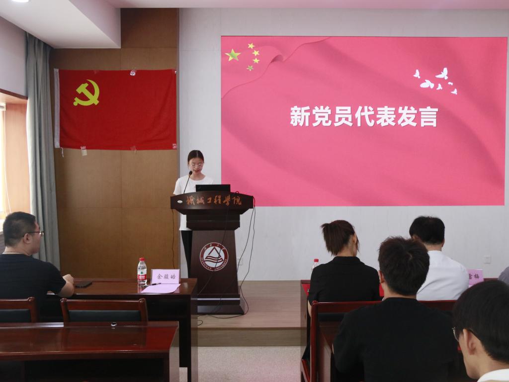 伴随着庄严的《国际歌》,仪式正式开始。孟召双宣读本学年发展的73名新党员名单并表示祝贺,她希望他们在今后的学习生活中进一步发挥党员的先锋模范作用。潘智琦带领新党员宣读入党誓词,激昂的宣誓表明了党员们对党忠诚的决心。新发展党员代表徐冉冉发言,她表示入党是一份光荣,更是一份责任,她代表新同志们作出庄重承诺:会坚定不移跟党走,把忠诚书写在党和人民的事业中,同时加强理论武装,坚定理想信念,不断提高专业能力,投身党和国家的建设中。