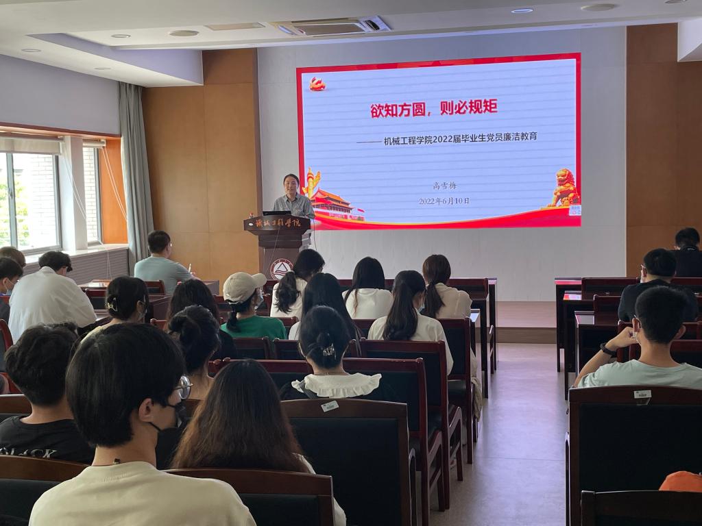 高雪梅以《欲知方圆,则必规矩》为题开展了一堂生动的党员廉洁教育课。她以习近平总书记重要讲话中的“扣好廉洁从政的第一粒扣子”引入,并从“为何要守纪律、讲规矩”“什么是党的纪律和规矩”“如何做到守纪律、讲规矩”三部分展开。她结合实际案例,深入浅出地让学生党员了解到党的政治纪律、组织纪律、廉洁纪律、群众纪律、工作纪律和生活纪律的具体要求是什么,让他们做到“知而深深畏”。同时,她从坚定理想信念、锤炼优良作风、增强能力本领、秉持敬畏之心四个方面引导毕业生党员们在今后的学习工作中要做到“想干事、能干事、干成事、不出事、善合作”,鼓励学生勇担重责,修炼“心理韧性”,做一名有独立思考能力的青年、有情怀的知识分子。最后,高雪梅代表学院党委祝福毕业生乘时代春风,扬奋斗风帆,一路勇敢,追逐梦想,不负美丽青春。