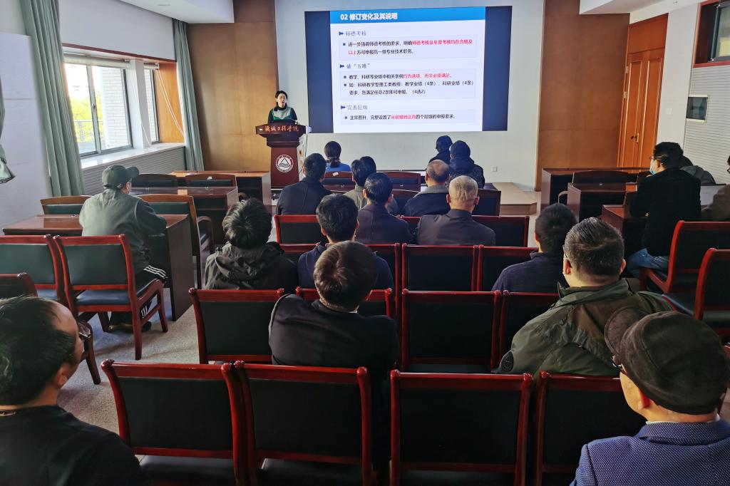 为切实帮助教师了解和理解学校新修订的职称评审政策,为师生办实事,11月10日下午,det365登录网站主页在C302会议室举办职称评审政策解读会,邀请人力资源处师资科科长王宇灏为大家解读2021年新修订的职称评审政策。det365登录网站主页党委书记高雪梅出席会议,近30名教师参加会议。