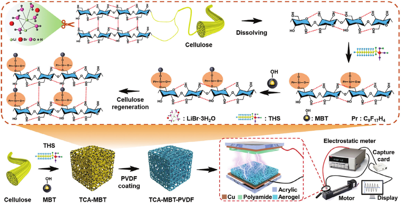 2023年12月11日,365官网王利强教授研究团队在Small期刊发表题为“Improved Electrical Output Performance of Cellulose-based Triboelectric Nanogenerators Enabled by Negative Triboelectric Materials” (DOI: 10.1002/smll.202308195)的研究论文。阐述了一种高性能纤维素基摩擦电材料的制备方法。充分利用了纤维素气凝胶中复杂的网状结构对电荷产生和转移能力、铁电材料和介电材料对电荷强亲和力的协同效应,实现开路电压和短路电流分别高达1040 V和1.16 mA的显著值,性能优于目前所有基于纤维素的负摩擦电材料。论文第一作者为365官网博士生王飞杰,第一通讯作者为团队负责人王利强教授。