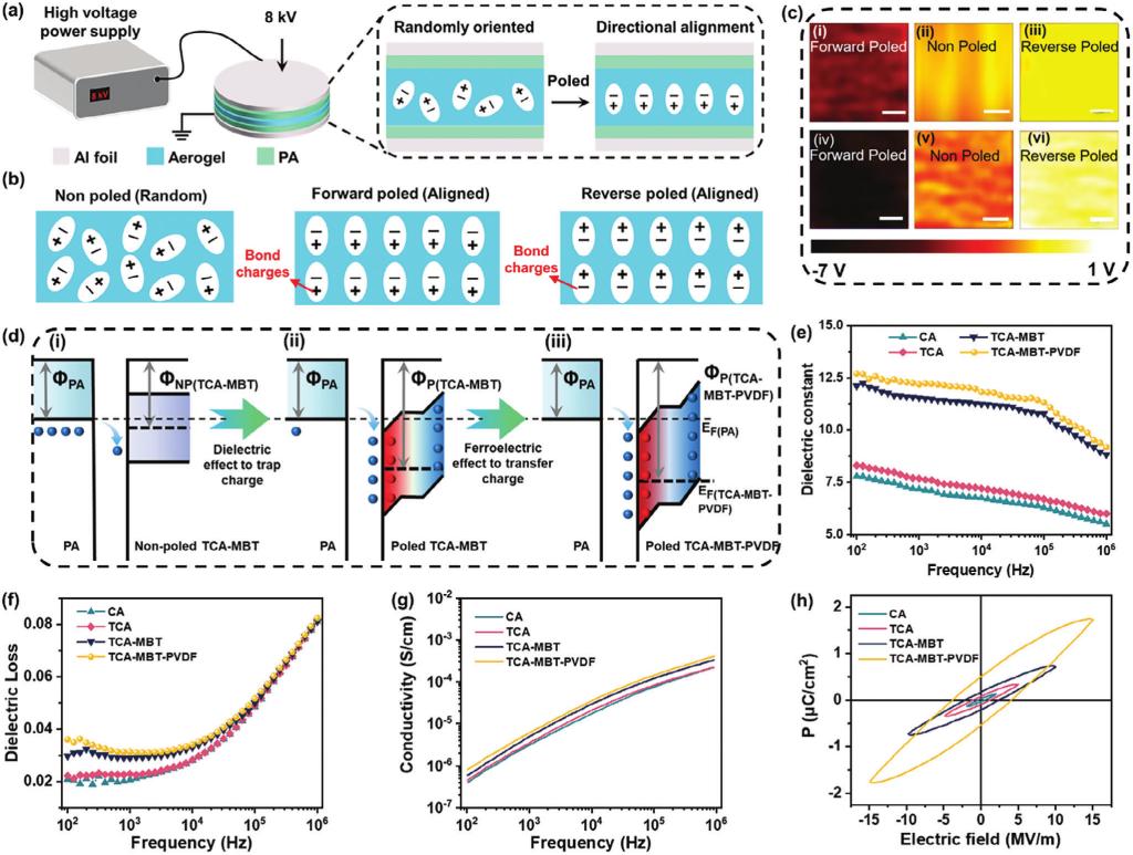图2 (a)纤维素基TENG的极化处理示意图。(b)不同极化条件下偶极子变化示意图和KPFM图像。(d)摩擦电材料表面之间的电荷转移行为示意图及其相应的能带修正。(e-h)材料介电常数、介电损耗、交流电导率、P-E磁滞回线