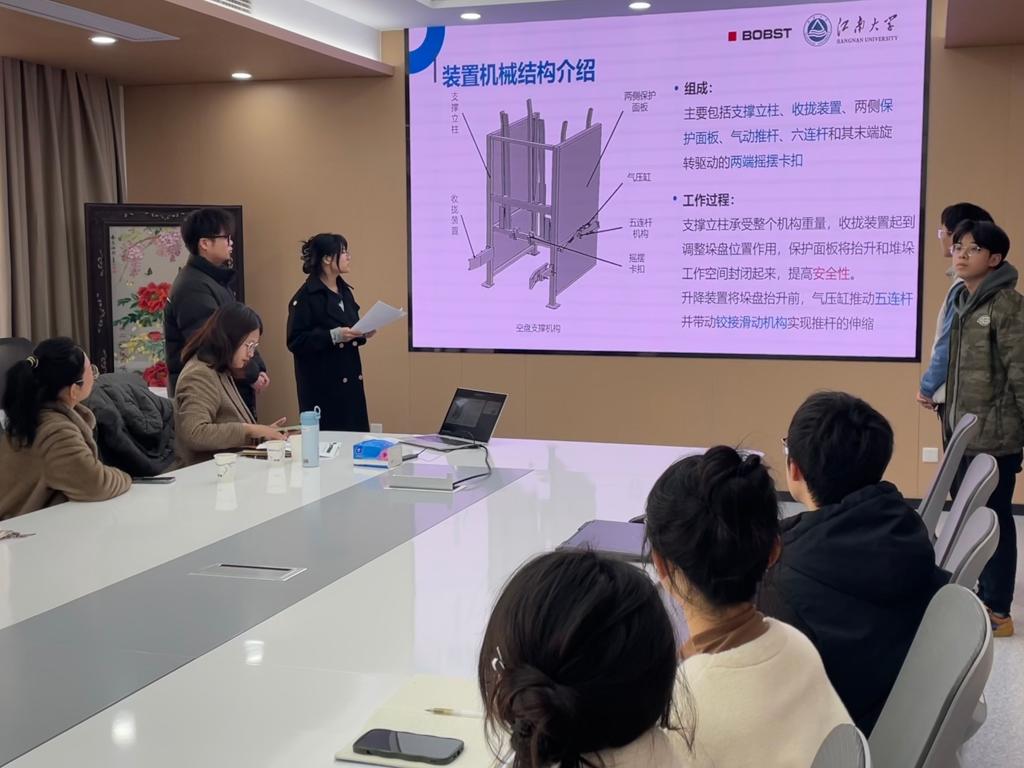 经自主申报,学院初审,课题发布与实践,2个课题共7组项目28名候选人进入最终答辩环节。7组候选人分别围绕“人机工程设计:重物出入库”“APT托盘自动堆垛机设计”课题开展汇报。评审专家根据候选人的综合表现进行现场提问与评定,最终确定2组8名博斯特奖学金人选。课题导师对每个项目进行了细致点评与指导。